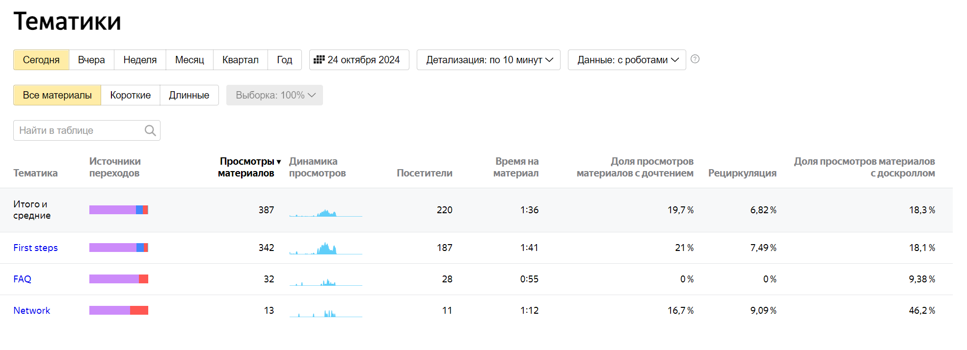 Отчет дает краткую статистику по контенту за выбранный день или период. Статистика включает данные о просмотрах и взаимодействии пользователей с материалами документации.